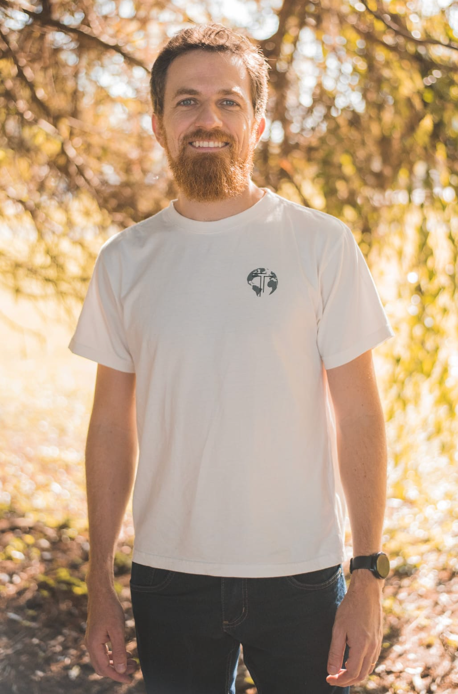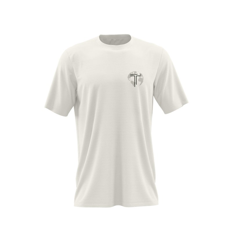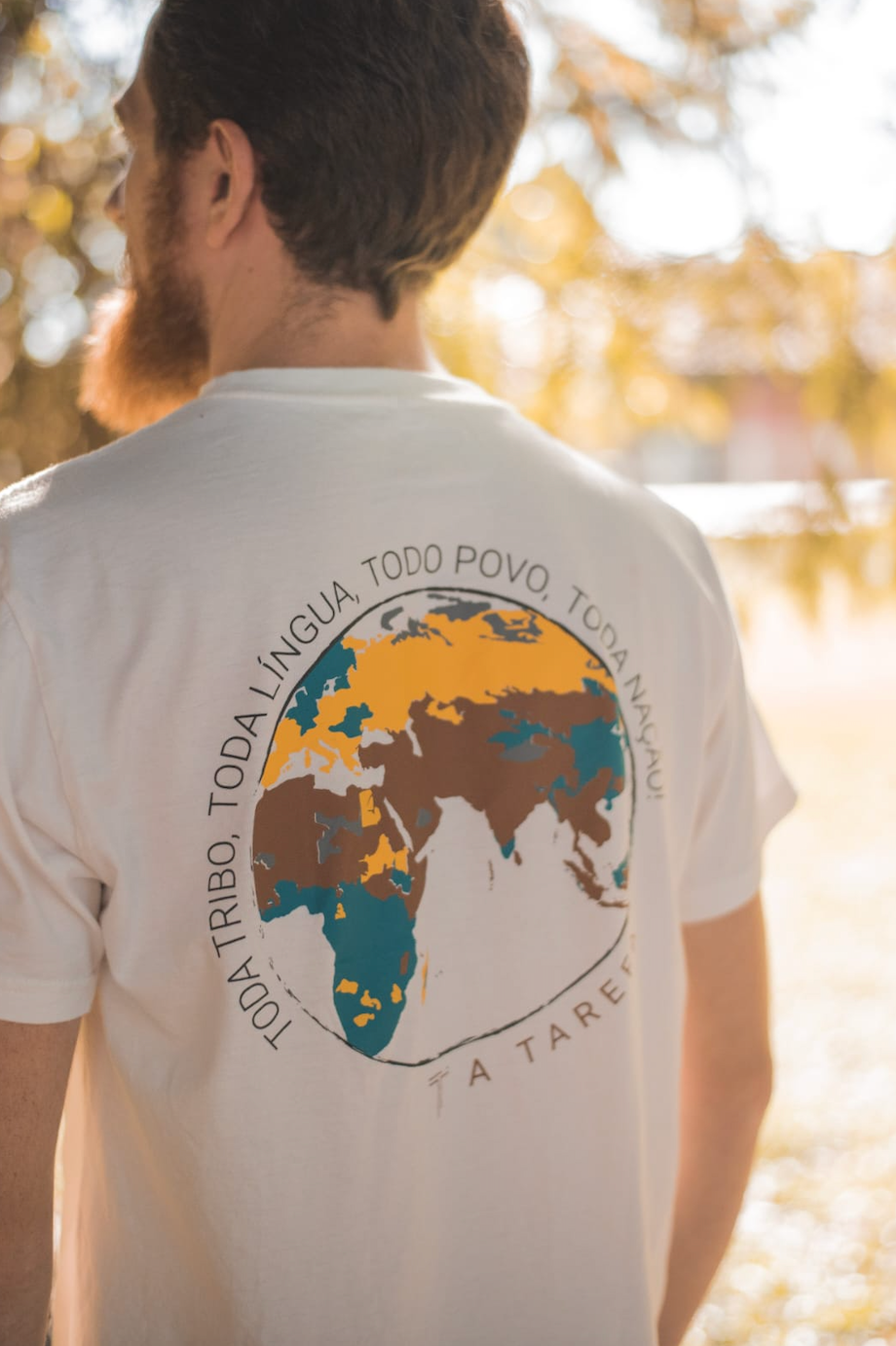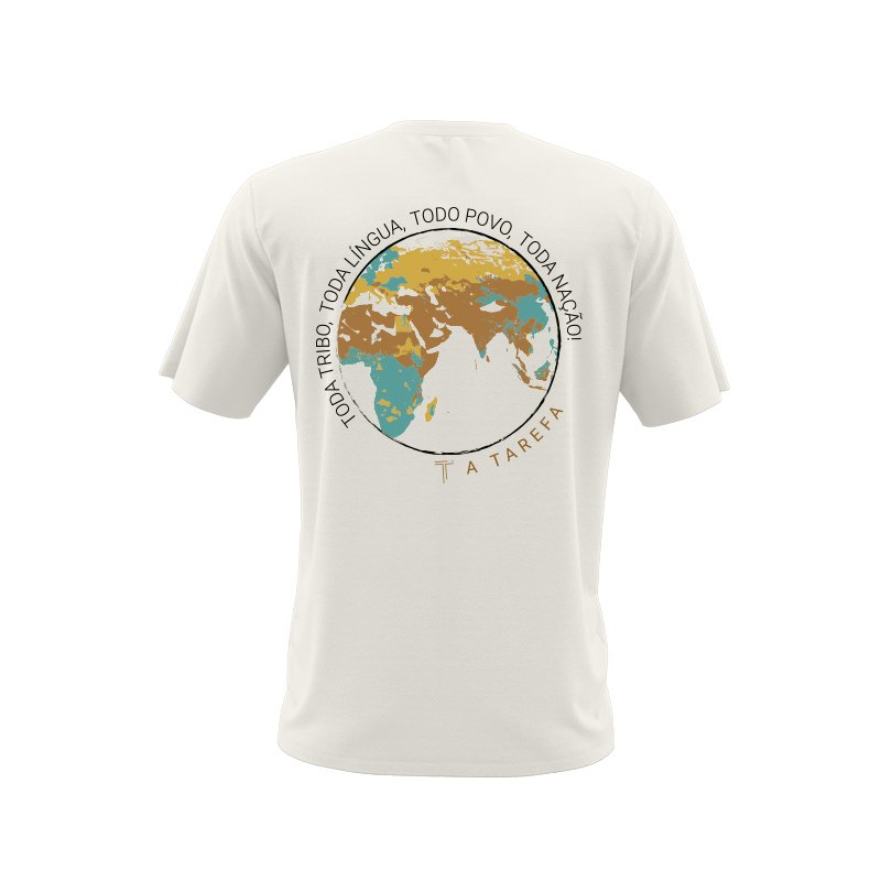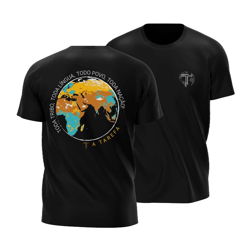 Camiseta com logo A Tarefa na frente e mapa mundi estilizado atrás.